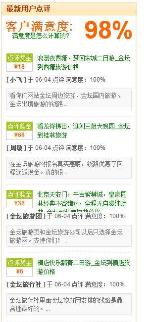 看如上图片,金坛乐游网秉承用户至上的观念,总体客户满意率打到了98%,在金坛旅行社同行里出处于佼佼者的地位。