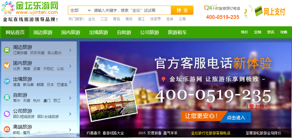 摘要:金坛乐游网是金坛最专业的旅行社有限责任公司,是金坛地区最大的在线旅游平台,也是金坛第一家启用金坛旅游线路在线预定、金坛旅游酒店在线预定、金坛旅游门票在线预定、金坛旅游租车在线预定、金坛公司组团旅游在线预...