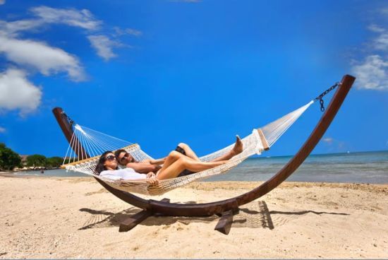 在白色沙滩上,躺在月牙状的吊床上,可以感受到阳光触摸着肌肤的绿洲里的安详。